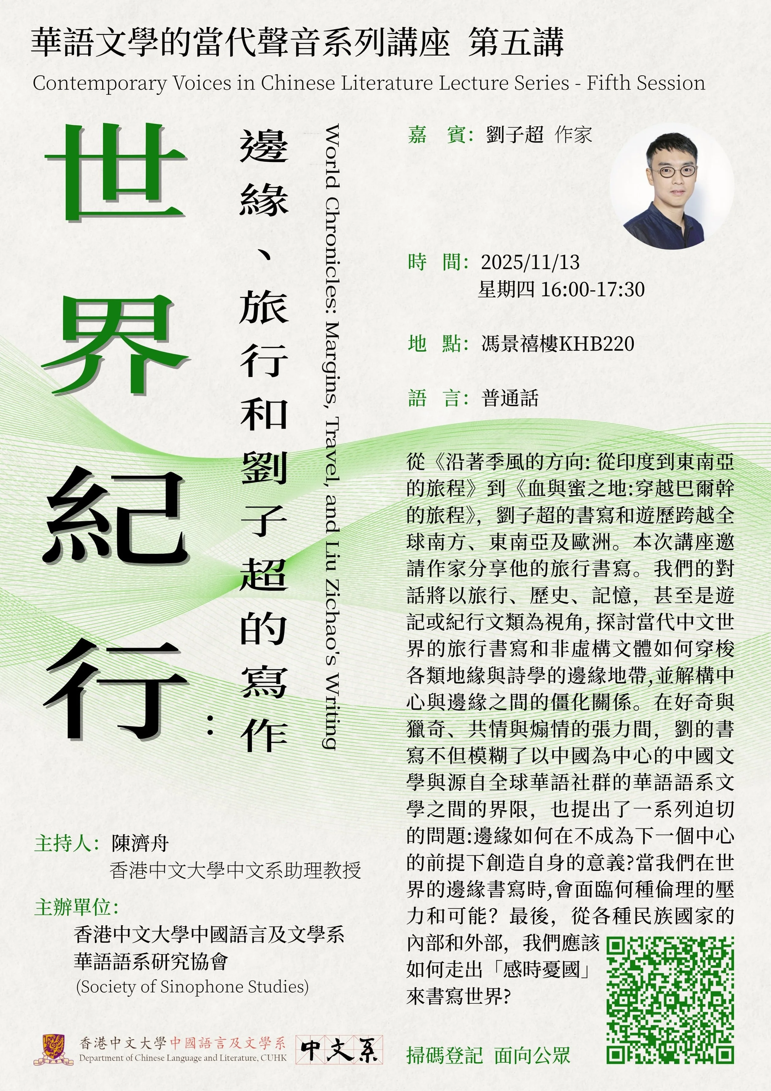 This lecture invites writer Liu Zichao to discuss his travel writing across the Global South, Southeast Asia, and Southeastern Europe, from Chasing the Monsoon: Journeys from India to Southeast Asia to Blood and Honey: A Journey Across the Balkans. The conversation will explore Liu's work through the lens of travel, history, memory, and the genre of youji 遊記 or jixing 紀行 (travel writing or travel chronicles). By reading Liu’s work, we examine how contemporary Chinese travel writing navigates geographical and conceptual margins and destabilizes reified boundaries between center and periphery. Liu’s literary reportage, blending curiosity without voyeurism and empathy without sentimentality, complicates boundaries between Chinese literature centered on China and Sinophone literature emerging from Chinese-speaking communities worldwide. His peripatetic narratives also raise urgent questions: how do margins create their own meaning without becoming the next center? What ethical possibilities emerge when we write from and about the world’s peripheries? What is the urgency of writing about the world and out of “obsession with China?”